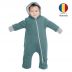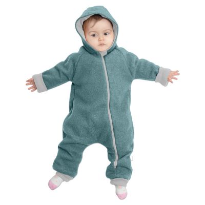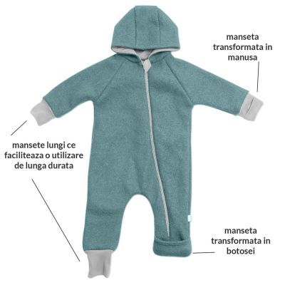 Despre Salopeta overall din lana fiarta dublata cu bumbac, Kidizi Old Mint 6-18 luni, prevazuta cu gluga si mansete transformabile in manusi si botosei