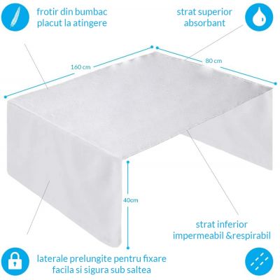 - poate fi asezata sub sau deasupra cearceafului (partea impermeabila de pe interior este dublata la exterior de frotir moale din bumbac)