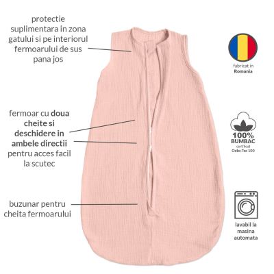 Intrucat in primele luni de viata bebelusii nu au inca dezvoltata optim capacitatea de autoreglare a temperaturii corporale si caldura excesiva poate fi mai daunatoare decat frigul, este foarte important ca ei sa fie imbracati corespunzator. Din acest motiv am creat saculetul de vara din muselina dubla cu o grosime de doar 0.3 tog si care poate fi folosit de la aproximativ 3.5 kg si pana la 8-10 kg.