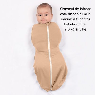 – Marimea S – recomandata pentru nou-nascuti cu greutatea intre 2.6 si 5 kg - ideala pentru primele saptamani de viata,, cand reflexul Moro este foarte activ si bebelusul are nevoie de continere si liniste. Lungimea sistemul de infasat S este de 58 cm
