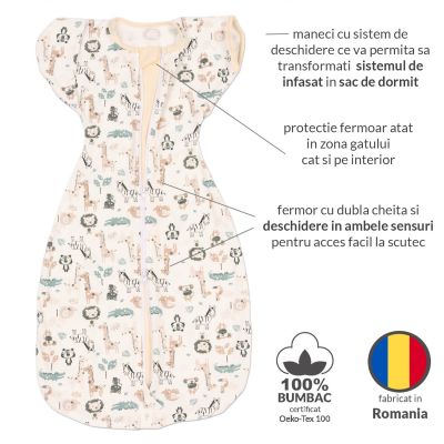 Despre Set 2 sisteme de infasat transformabile in sac de dormit, 1-6 luni Kidizi Swaddel Confort UP Grey Stars Safari, 100% bumbac, 0.5 tog