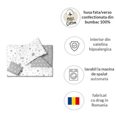 Materiale de calitate certificate - Atat husa de exterior cat si umplutura din interior sunt confectionate din materiale certificate si sigure pentru pielea delicata a bebelusului. Combinatia de umplutura antialergică și 100% bumbac pe exterior garanteaza faptul ca nu vor provoca alergii si vor asigura copiilor dvs. un somn linistit si sanatos