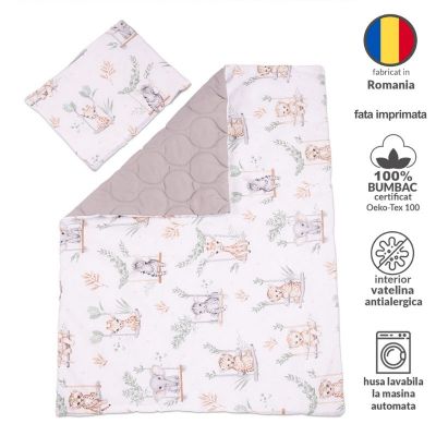 Un set pratic format din cearceaf, paturica,perna si 2 aparatoari matlasate - toate sunt confectionat din materiale de cea mai buna calitate si sau culori si imprimeuri simpatice.