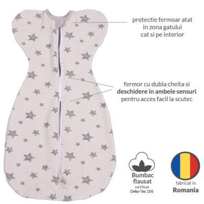 - Este usor de imbracat/dezbracat datorita fermoarului dublu care va permite sa schimbati scutecul fara a dezbraca bebelusul de intreg sistemul de infasat