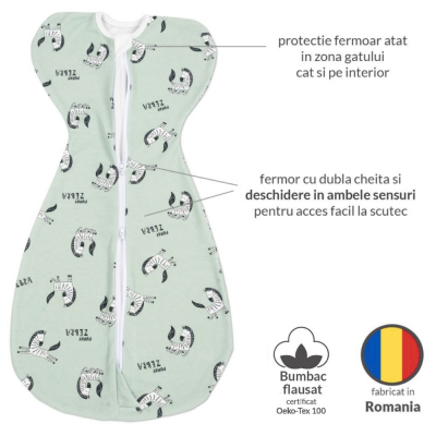 - Este usor de imbracat/dezbracat datorita fermoarului dublu care va permite sa schimbati scutecul fara a dezbraca bebelusul de intreg sistemul de infasat