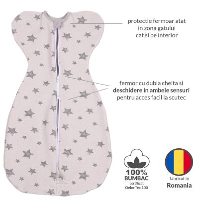 Despre Sistem de infasat cu fermoar dublu Kidizi Swaddel Confort Grey Stars 0-3 luni