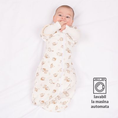 - Este usor de imbracat/dezbracat datorita fermoarului dublu care va permite sa schimbati scutecul fara a dezbraca bebelusul de intreg sistemul de infasat