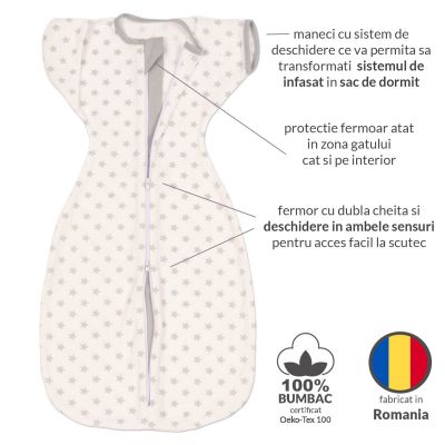 Despre Sistem de infasat transformabil in sac de dormit, 1-6 luni Kidizi Swaddel Confort UP White Grey Stars, 100% bumbac, 0.5 tog